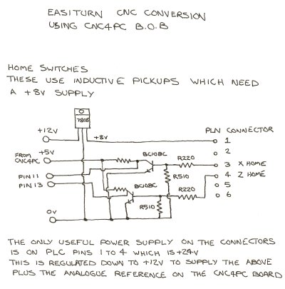 The Over-travel switches appear to be mechanical - so easy just to connect to the BOB. The home sensors however are an inductive pickup which need a simple transistor amplifier to convert to Logic levels. I stole the circuit from the Denford Manual: