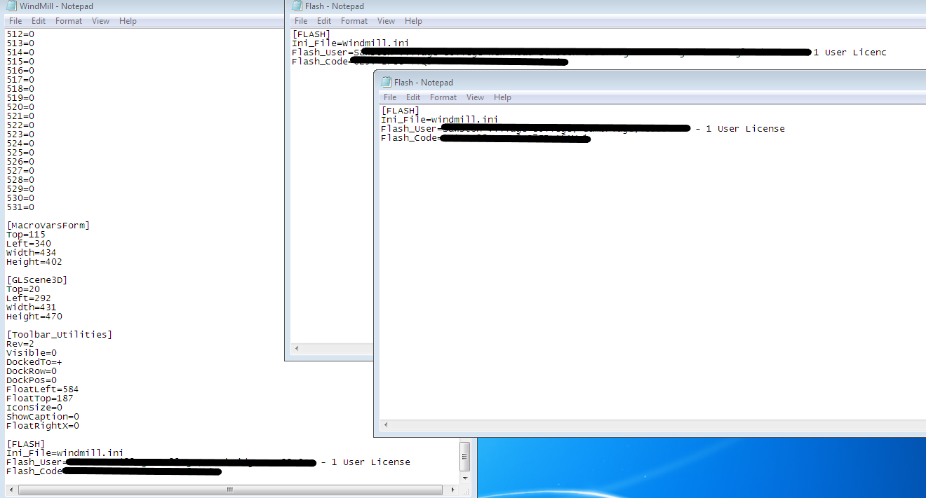 I have located the flash.ini files on the floppy drives and used the 1021 PDF file to copy them in to the windmill.ini text file, but the software continues to ask for either the dongle or registration disks.